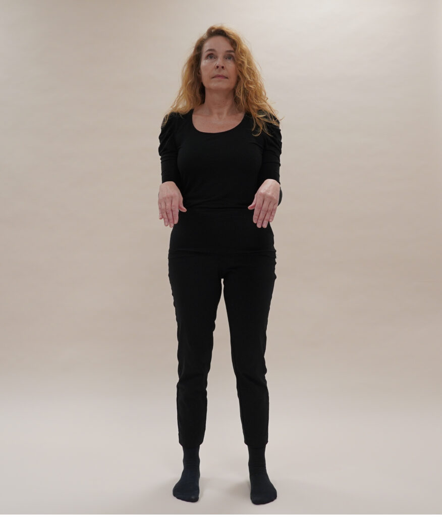 - Stellen Sie sich aufrecht hin, die Füße fest auf dem Boden, geerdet und stabil.