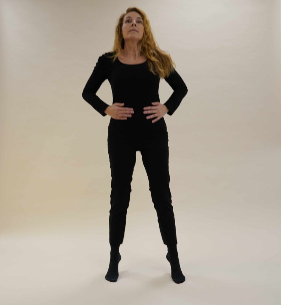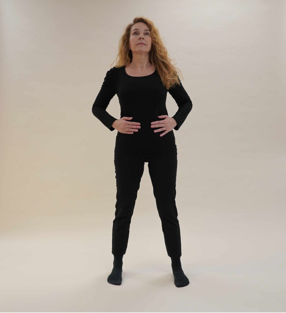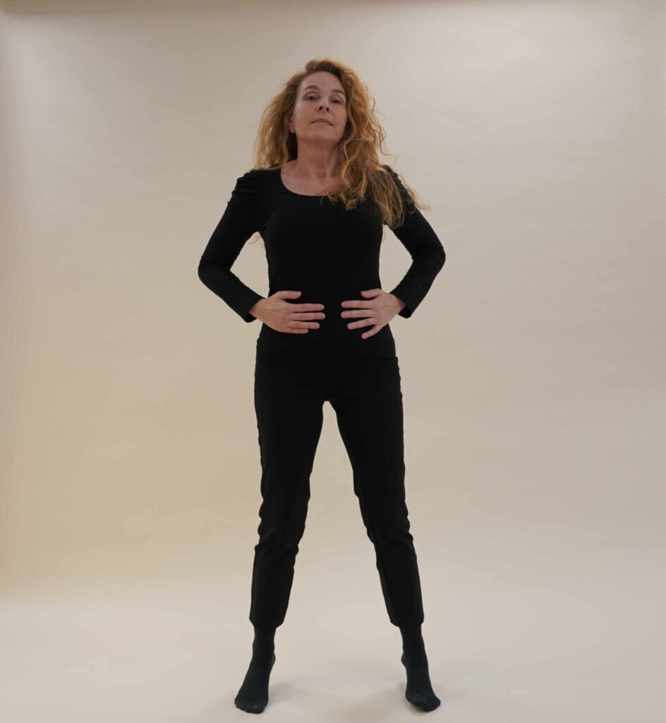 • Hände auf den Bauch: Legen Sie beide Hände auf die Seiten Ihres Bauches, auf Höhe des Bauchnabels.