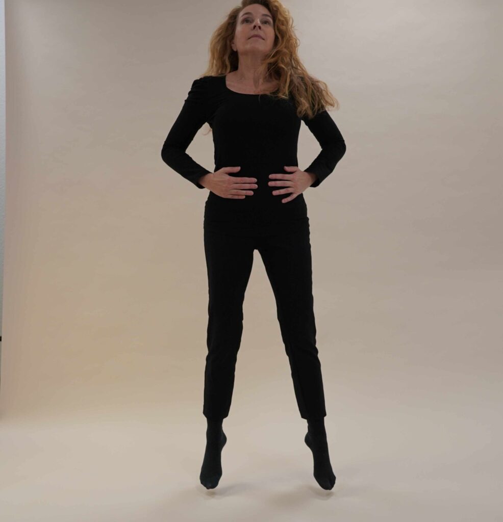 8. Lassen Sie Ihre Hände weiterhin auf dem Bauch liegen und hüpfen Sie anschließend locker auf und ab, mindestens fünf- bis achtmal. Spüren Sie, wie sich Ihre Lebenskraft im Körper bewegt.