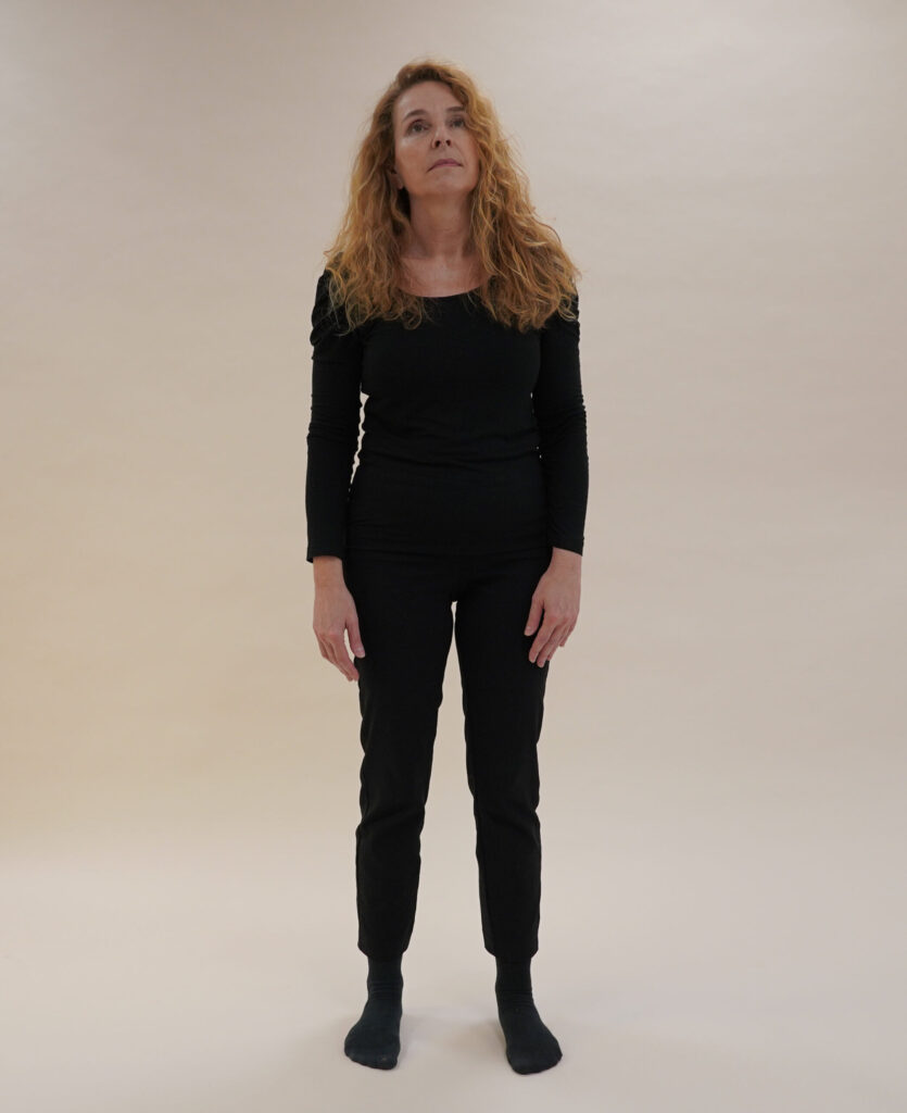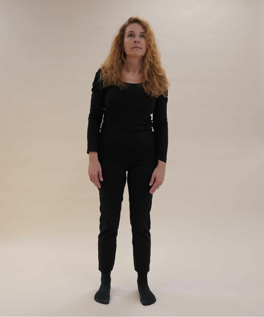 Stellen Sie sich aufrecht und möglichst barfuß hin. Atmen Sie ruhig und gleichmäßig und lassen Sie Ihre Gedanken für einen Moment los.