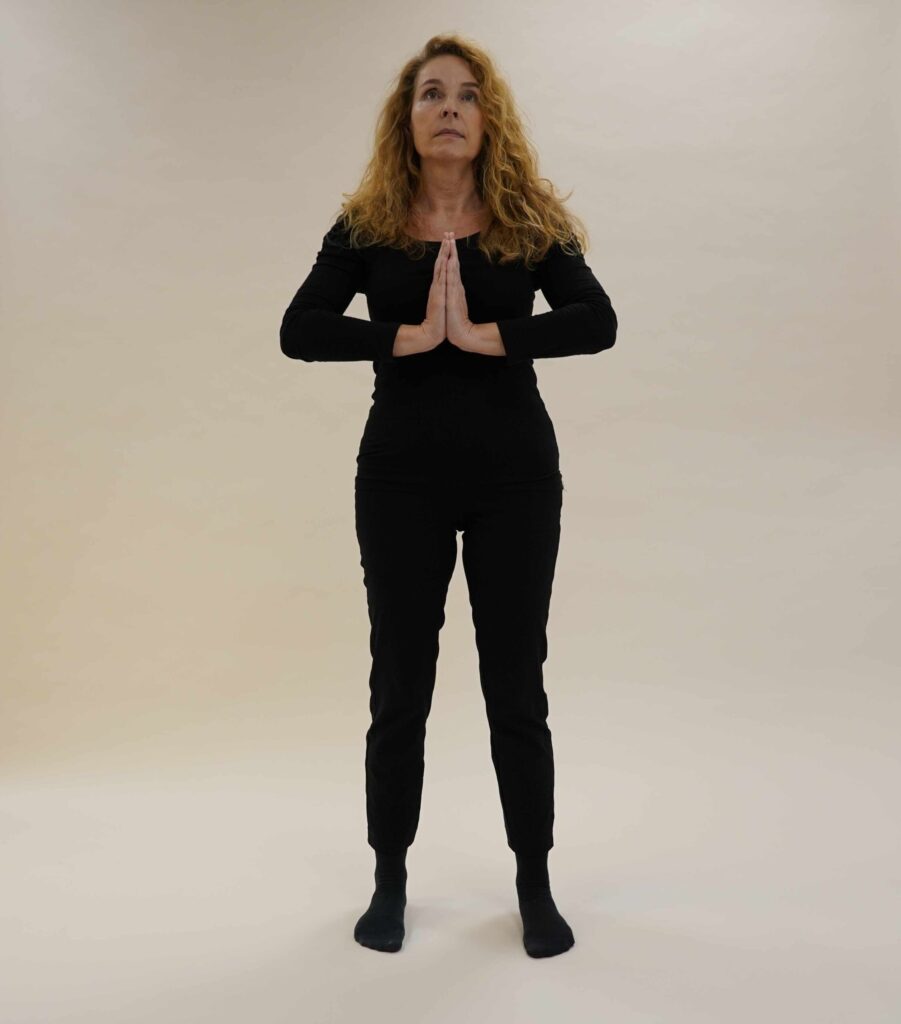 Legen Sie dann die Hände vor der Brust zusammen, die Fingerspitzen zeigen nach oben.